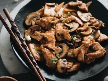 This amazing side dish is made with a exquisite blend of button mushrooms, sesame oil, black bean garlic sauce, honey, chili garlic sauce, and chopped scallions. Served in a small bowl.