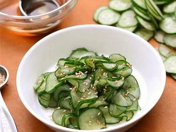 Cucumber slices battered in a sauce made of low-sodium soy sauce, rice vinegar, garlic, red pepper flake, salt, and sugar. Topped with sesame seeds. Served on a small plate.