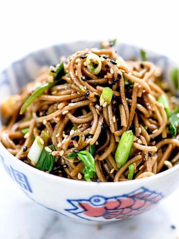 This delicious alternative to rice is made with soba noodles cooked in a sauce consisting of soy sauce, sesame oil, rice vinegar, sugar, freshly ground black pepper, and toasted sesame seeds. Served in a small bowl.